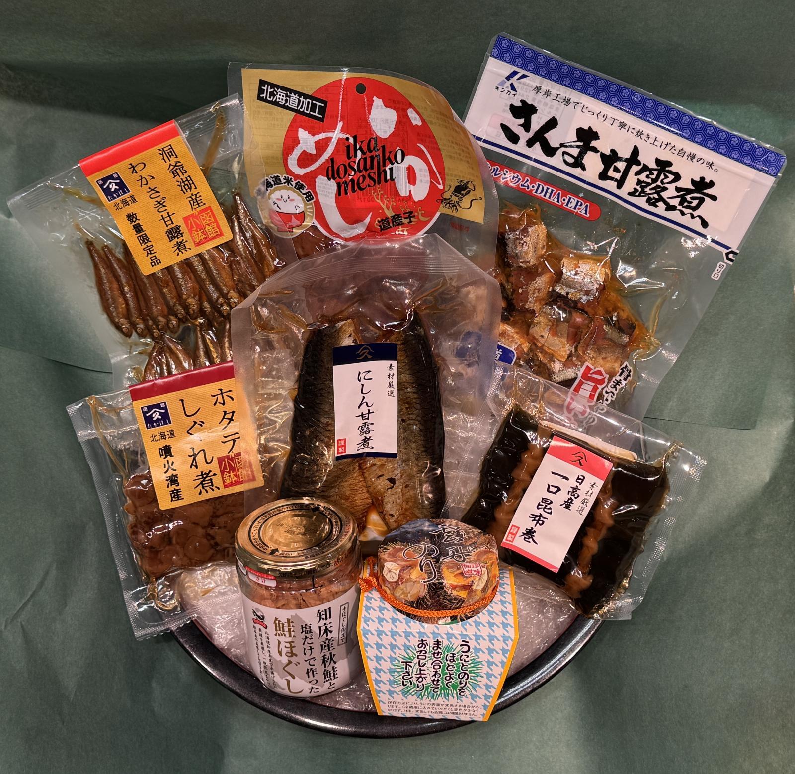 鮭フレーク 110g、雲丹のり 160g、帆立カレー 170g、にしん甘露煮 100g、一口昆布巻 8個、いかめし 2尾、さんま甘露煮 180g、わかさぎ甘露煮 70g、ほたてしぐれ煮 60g